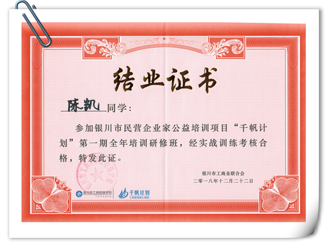 伊百盛陳凱榮獲“千帆計(jì)劃”培訓(xùn)合格結(jié)業(yè)證書(shū)