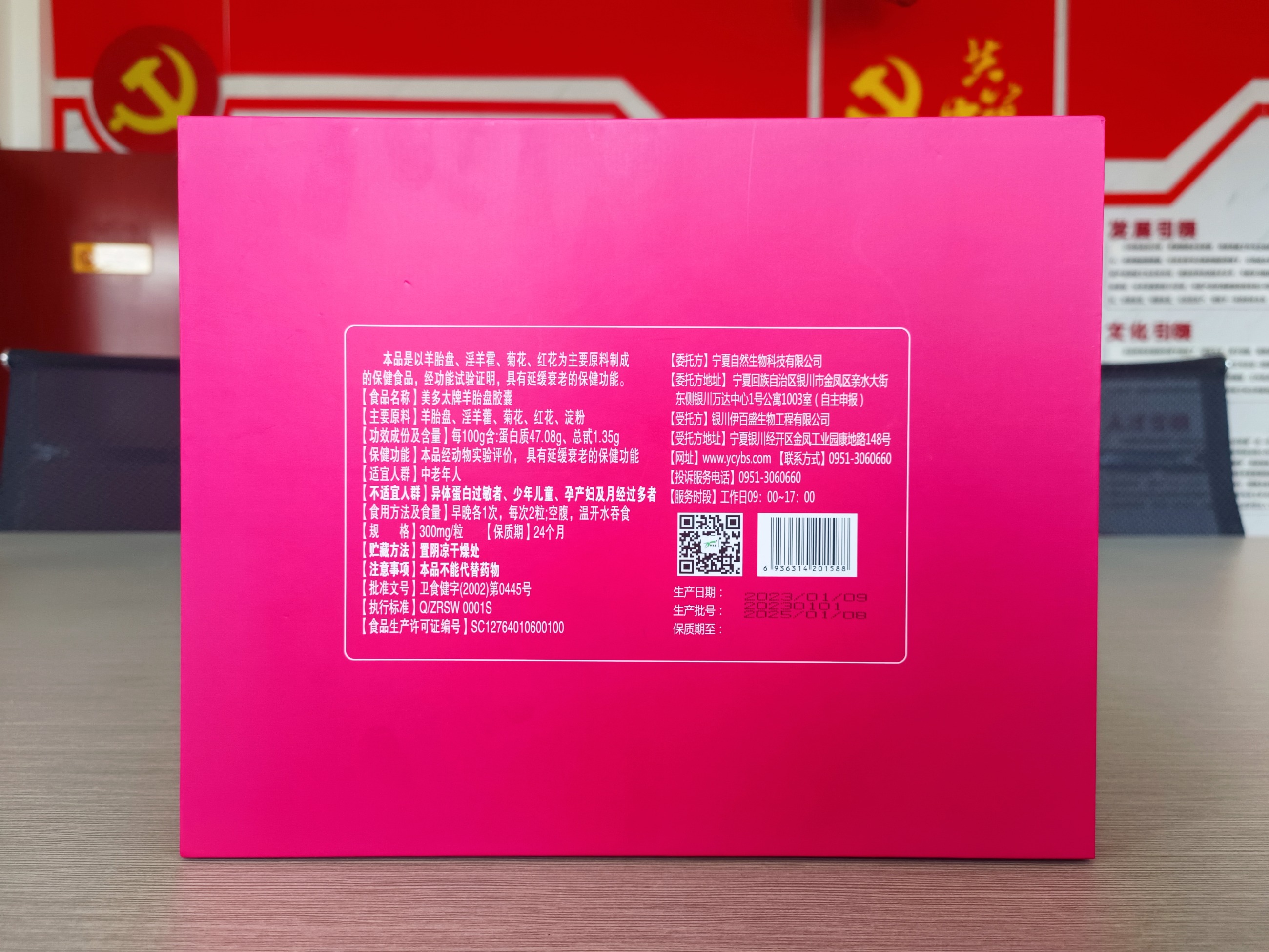 本品是以羊胎盤(pán)、淫羊藿、菊花、紅花為主要原料制成的保健食品,經(jīng)功能試驗(yàn)證明,具有延緩衰老的保健功能。